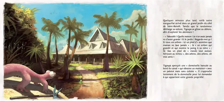 Bande dessinée de la Réunion : Résumé : Oté ! Quel margouillat extraordinaire ! Tigouya est un margouillat très curieux qui a toujours vécu dans les montagnes de Mafate à la Réunion. Il rêve de voir l’océan. Camouflé dans le sac à dos d’un touriste, le petit animal se retrouve bientôt à bord d’un bus, puis sur une plage de sable blanc. «Tabouèèèt ! c’est donc cela la mer ? ». {rokbox size=|fullscreen| title=|Voir un extrait|}/images/PDF/tigouya-fr-extrait.pdf{/rokbox}