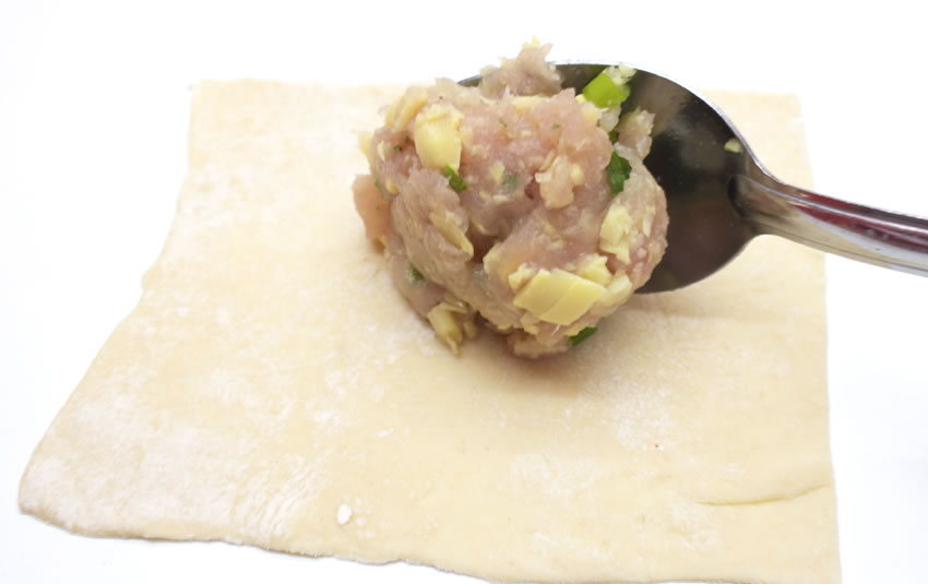 Pour les réalisez, déposez une cuillère à soupe de la farce réalisée au centre d’une feuille de pâte won-ton et rabattez les coins vers le centre en recouvrant presque la farce (elle doit rester visible). Pour que la pâte colle bien à la farce n’hésitez pas à presser la pâte contre la farce si nécessaire. Tentez de faire coller la pâte à la farce de sorte qu’elle forme une petite corolle autour de la farce.