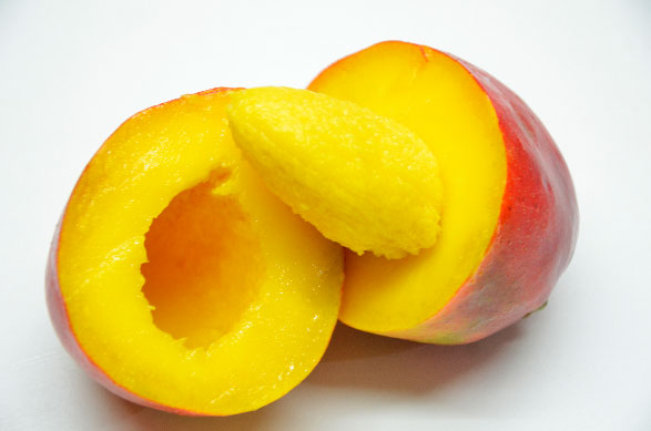 Arrivée à parfaite maturité, on déguste aussi bien sur la mangue nature, en la présentant en « hérisson ». Pour ce faire, on la coupe en trois afin d’obtenir deux “joues de mangue” et le noyau. Prenez les joues puis quadrillez-en l’intérieur avec un couteau bien acéré. Poussez ensuite la chair de la mangue en appuyant sur la peau, de petits cubes de mangues se retourneront et la joue de mangue aura désormais une forme convexe. La mangue mure est très juteuse et sucrée à souhait…