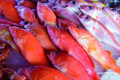 Le Rouge, poisson de La Réunion. Quatre-épices. Il existe deux variétés de quatre-épices, l'une dont on utilise les feuilles vert sombre et l'autre les baies encore vertes pour leur saveur mêlée de cannelle, girofle, poivre et muscade. Quinquina pays : Plante...