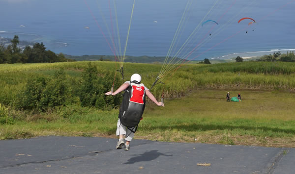 Quel est votre parcours ? Gilles : J’ai commencé en 1991, obtenu mon brevet de pilote en 1995 et ça fait donc presque une vingtaine d’années que je vole. J’ai fais un petit peu de compétitions mais je vole surtout pour le plaisir. J’ai eu l’occasion de participer à quelques stages de performances avec des personnes de l’extérieur qui sont venus à la Réunion, cela nous a permis de voler au Piton des Neiges, au Maïdo qui est un site magnifique mais là c’est vraiment le saut dans le vide et non pas un décollage, on se jette de la falaise. Il faut avoir vraiment beaucoup d’expériences et ces sites sont réservés aux pilotes confirmés qui ont le brevet. Toutefois, voler sans brevet est autorisé, il suffit juste d’avoir une assurance en Responsabilité Civile. L’assurance est obligatoire, pas le brevet, hormis pour les compétitions et pour voler sur certains sites.
